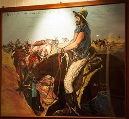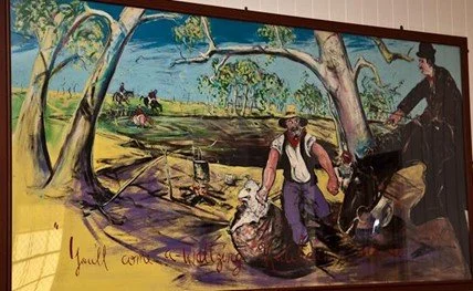 Back in 1959, Sawrey made a name for himself the old-fashioned way — by painting big, bold murals in country pubs. His first major works went up at the Kogan Creek Hotel, inspired by the words of Banjo Paterson. They weren’t fancy gallery pieces; they were proper bush stories painted large, and locals quickly claimed them as their own.